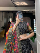 The timeless bandhani print chaniya choli showcases intricate ajrakh print and foil lacework, combining elegance and tradition in a stunning ensemble for Navratri